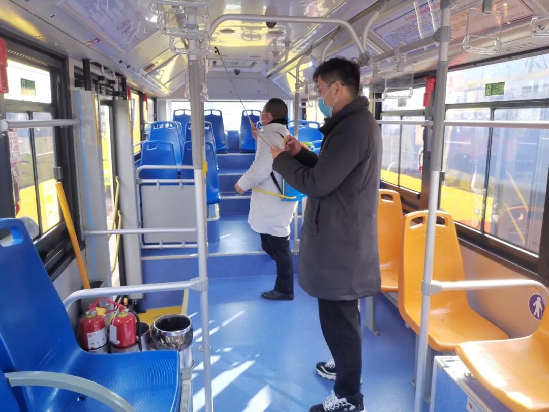 離下午到崗時(shí)間還有大半個(gè)小時(shí),汪俊便早早來到調(diào)度站內(nèi)。經(jīng)過兩次體溫檢測(cè)后,他來到即將開出的公交車上,仔細(xì)檢查車輛通風(fēng)設(shè)備,并在扶手、地面、座椅、吊環(huán)等部位噴灑消毒液。