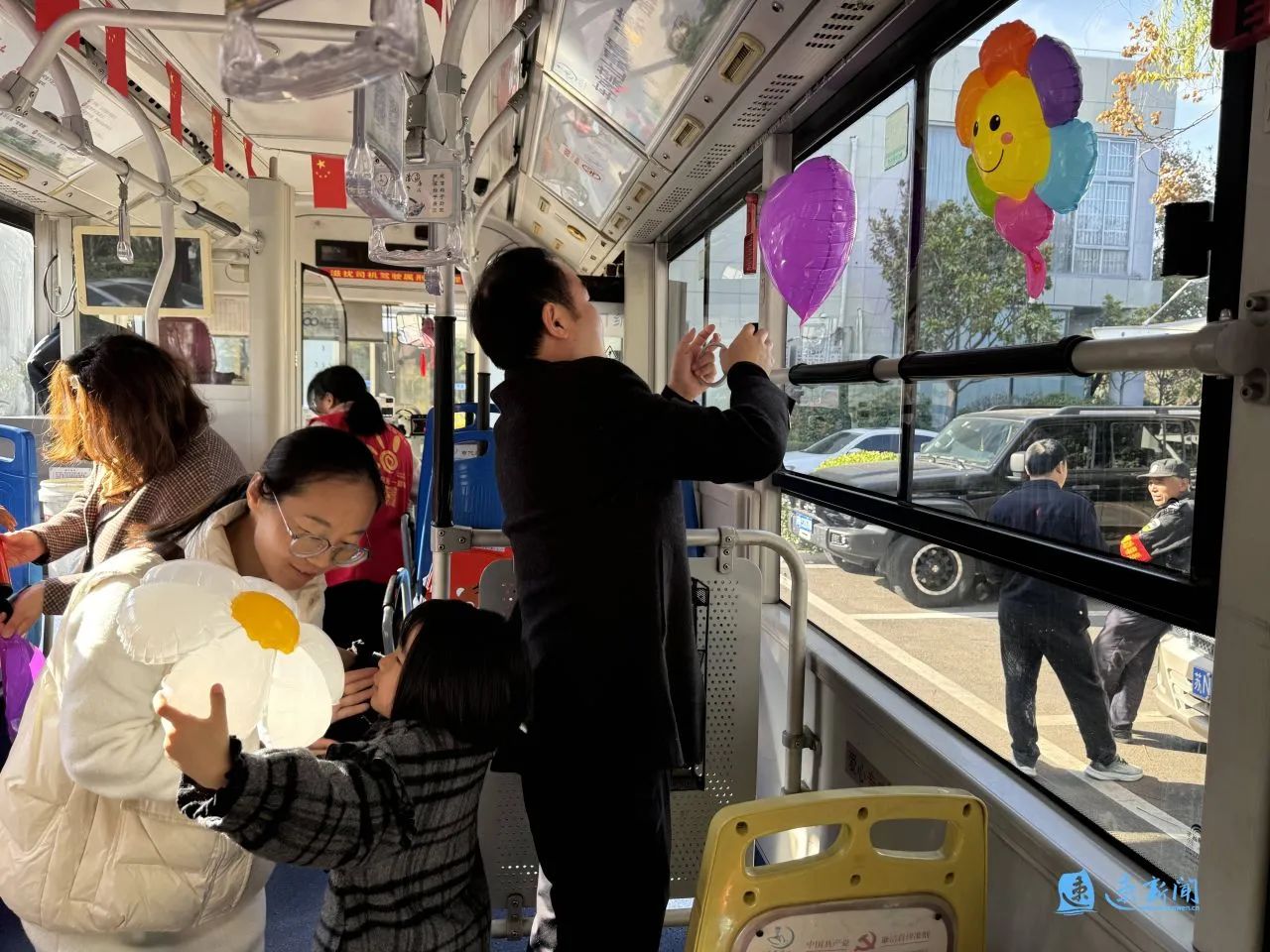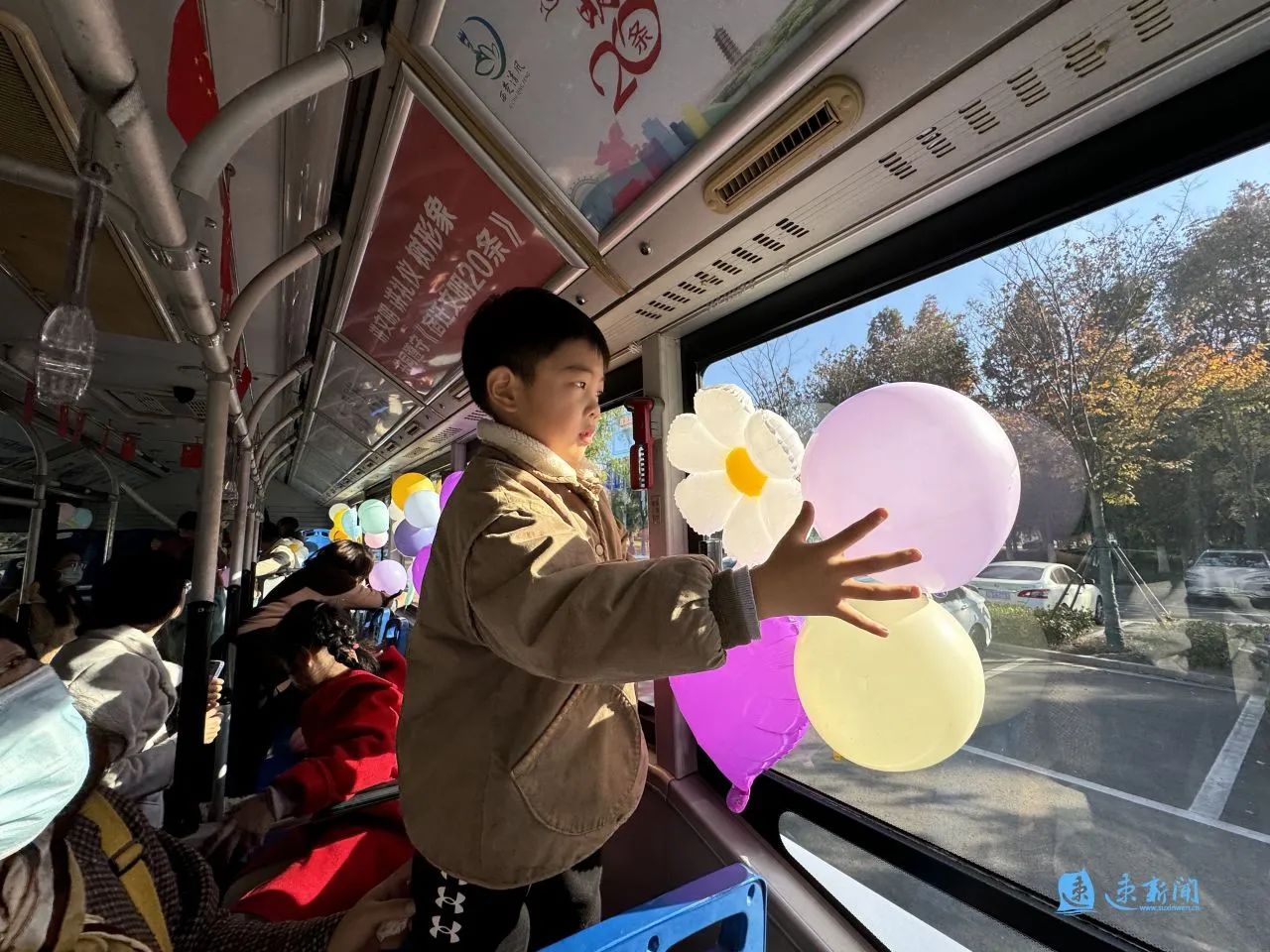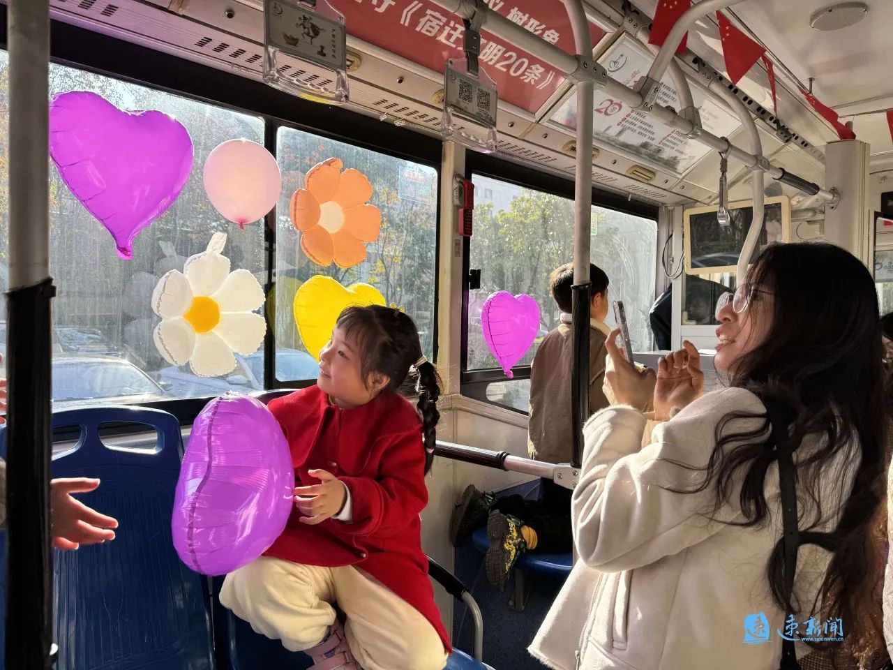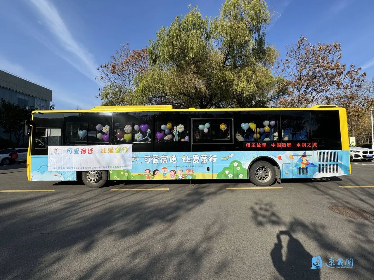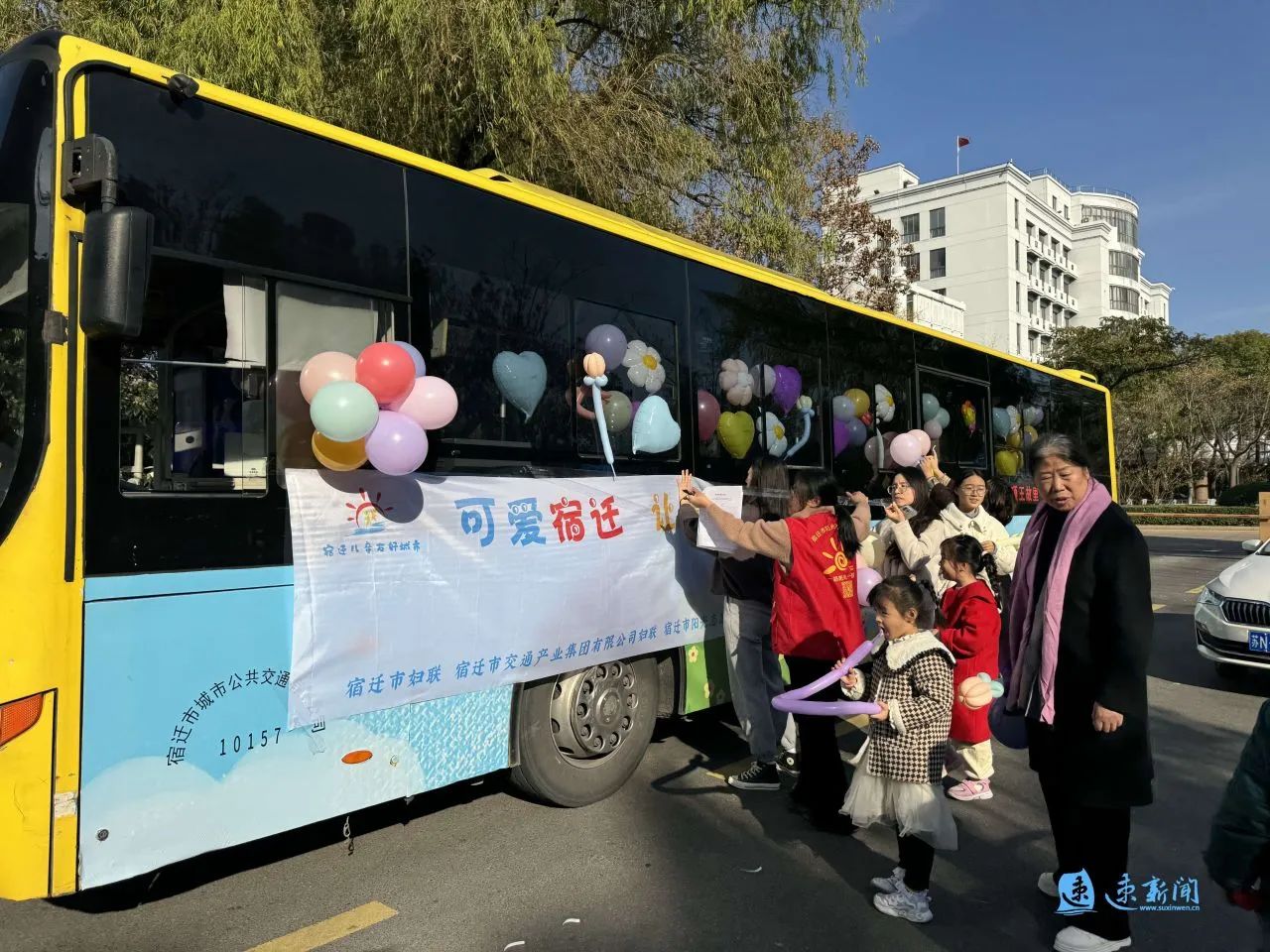 車窗被繽紛的氣球“占領(lǐng)”,車身貼著“可愛宿遷 讓愛童行”的標語……11月23日下午,宿遷市人民大道群眾大廈的院子里停放了一輛兒童友好公交巴士,等待著孩子們用愛和童趣裝點它。