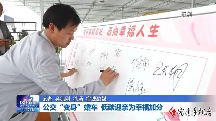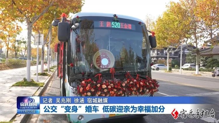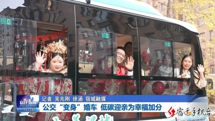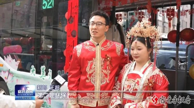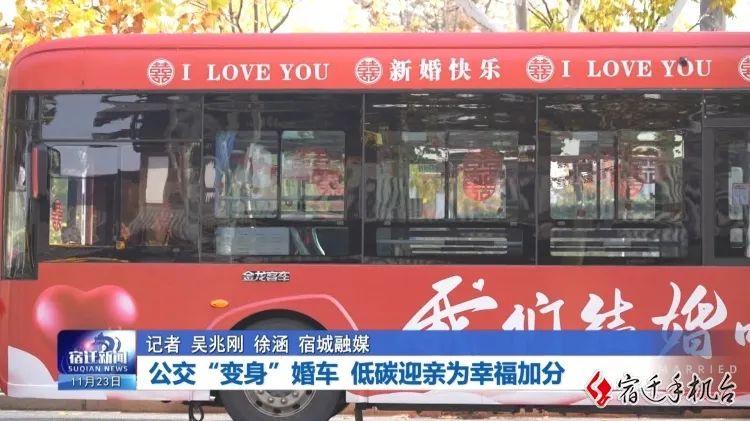 11月22日上午,在宿城區(qū)一家酒店門前,兩輛精心裝飾過的新能源公交車格外醒目,車頭系著大紅花,車窗貼著大紅“囍”字,車內掛滿吉祥祝福,以往用來顯示公交線路的LED屏,變成了見證兩位新人幸福時刻的“520專列”。伴隨著吉時到來,一對新人被親朋好友簇擁著走進公交婚車,駛向婚禮現場,車內到處是笑聲與祝福聲。