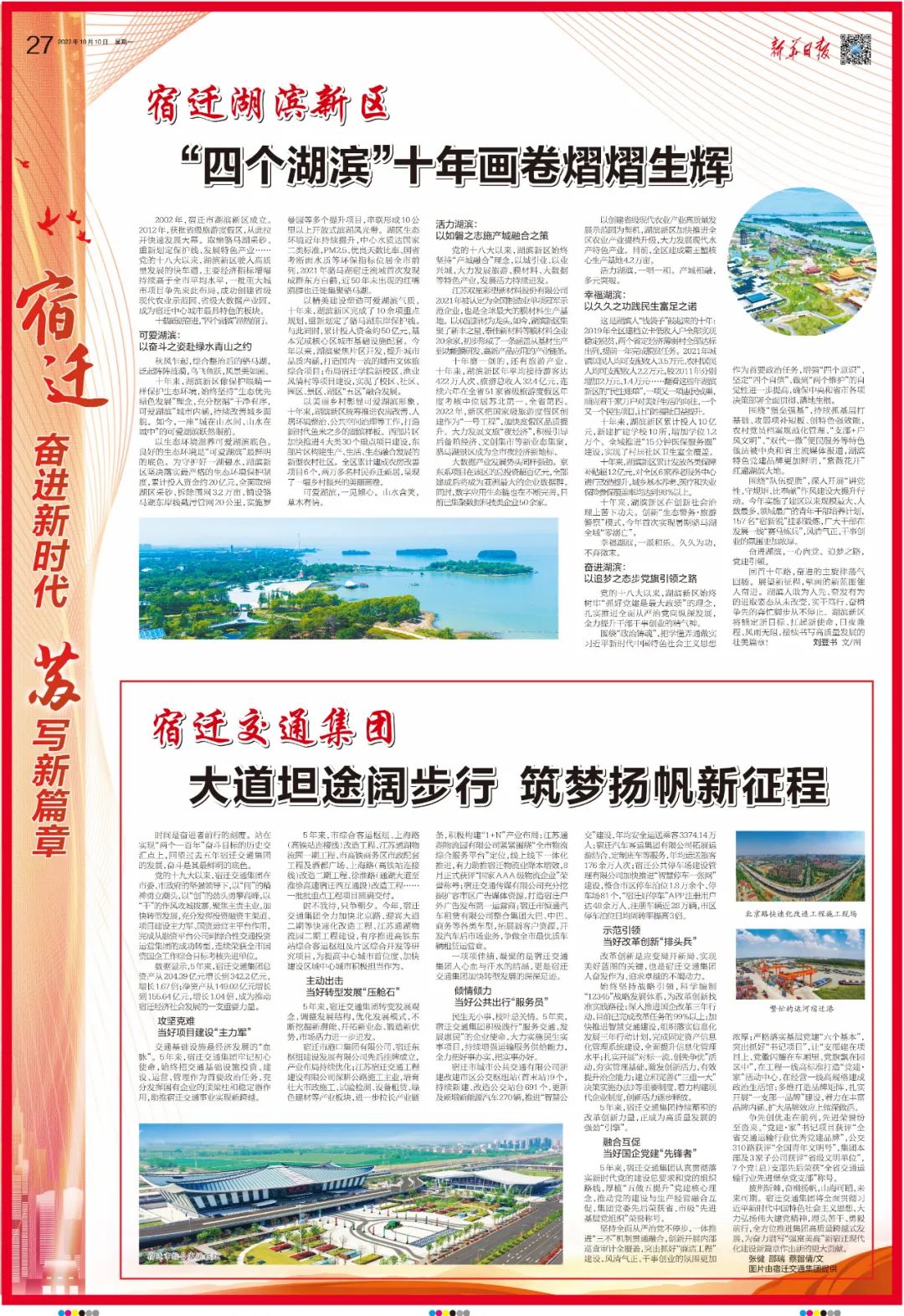 10月10日,《新華日?qǐng)?bào)》以《宿遷交通集團(tuán):大道坦途闊步行 筑夢(mèng)揚(yáng)帆新征程》為題,專題報(bào)道了集團(tuán)過去五年從融資平臺(tái)公司到綜合性交通投資運(yùn)營集團(tuán)成功轉(zhuǎn)型的發(fā)展歷程。全文報(bào)道如下: