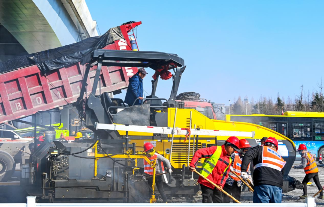 2月25日,青海湖路至駱馬湖路順利完成主線輔道瀝青下面層施工;