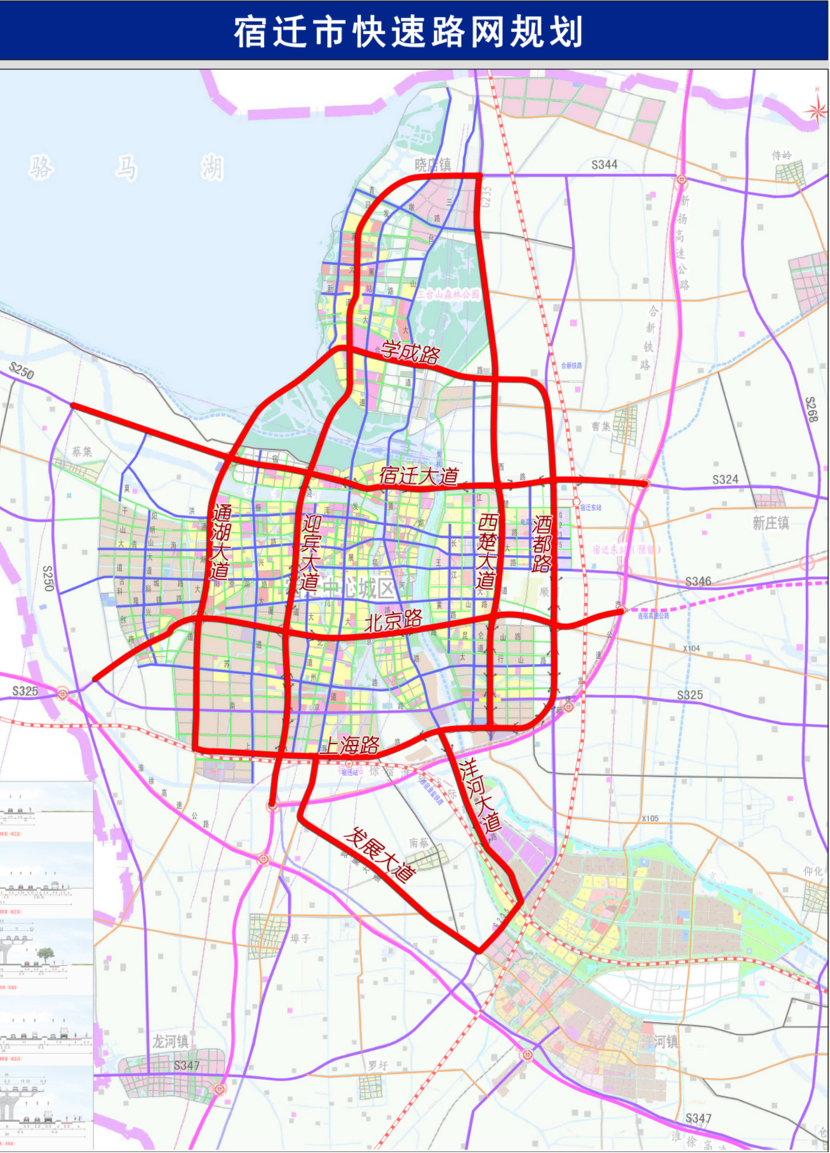 經(jīng)濟(jì)發(fā)展,交通先行。根據(jù)《宿遷市快速路網(wǎng)規(guī)劃(修編)(2018—2035)》,宿遷市“二環(huán)十射”快速路網(wǎng)總里程達(dá)166公里。其中,“內(nèi)環(huán)”由迎賓大道、北京路、西楚大道、宿遷大道(原宿支路)構(gòu)成,長(zhǎng)24公里;“二環(huán)”由通湖大道、上海路、酒都路、學(xué)成路構(gòu)成,長(zhǎng)55公里;“十射”為迎賓大道北延、新?lián)P高速連接線(xiàn)、西楚大道北延、富春江路、宿遷大道東延、宿遷大道西延、北京路東延、北京路西延、黃河南路、發(fā)展大道,總長(zhǎng)87公里。