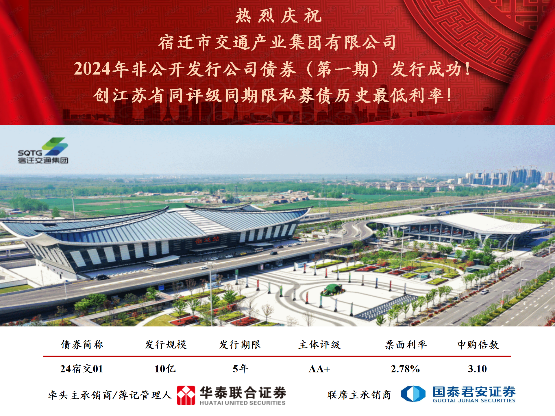 4月24日,宿遷交通集團(tuán)成功發(fā)行2024年非公開(kāi)發(fā)行公司債券(第一期),發(fā)行規(guī)模10億元,期限5年,由華泰聯(lián)合證券、國(guó)泰君安證券聯(lián)合承銷(xiāo),票面利率2.78%,創(chuàng)江蘇省同評(píng)級(jí)同期限私募債歷史最低利率。