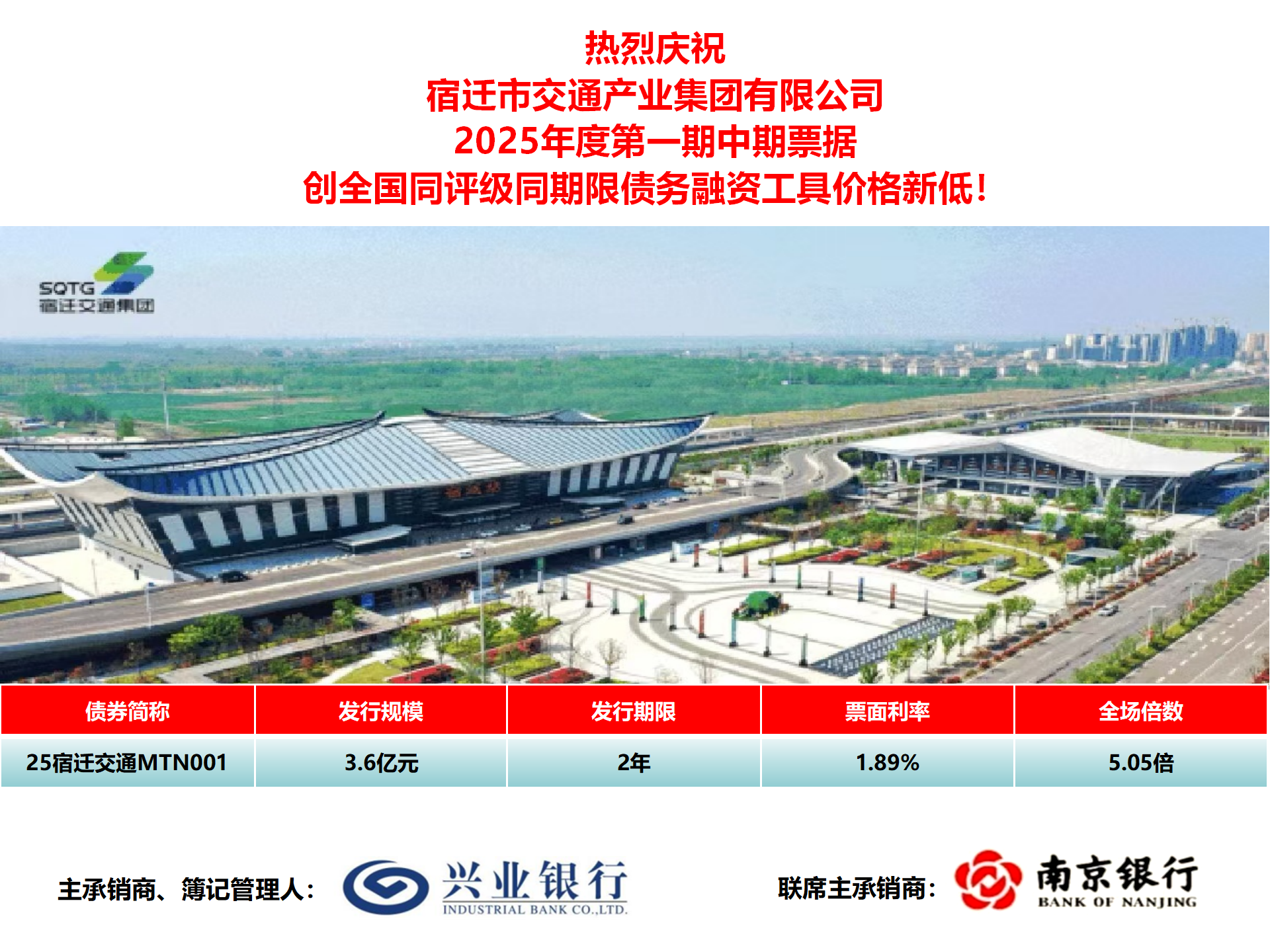 開門紅!宿遷交通集團(tuán)2025年第一期中期票據(jù)發(fā)行,利率創(chuàng)全國同評級同期限最低