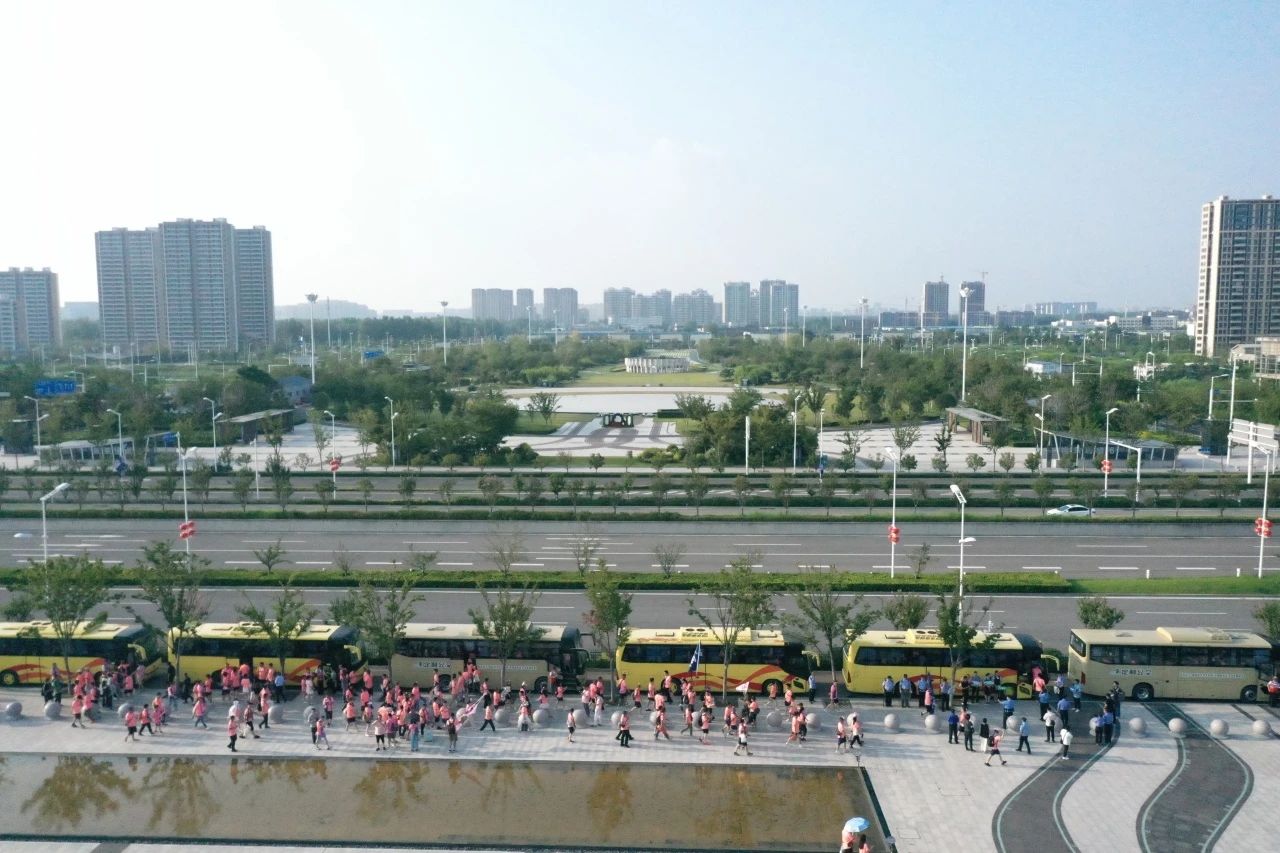 在這里,18輛由宿遷交通集團統(tǒng)籌調(diào)度的定制公交早已整裝待發(fā),志愿者們手持車輛編號牌在車旁引導。