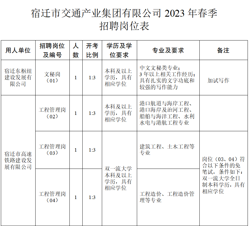 5. 具備招聘崗位要求的其它資格和條件。具體詳見《宿遷市交通產(chǎn)業(yè)集團有限公司2023年春季招聘崗位表》。