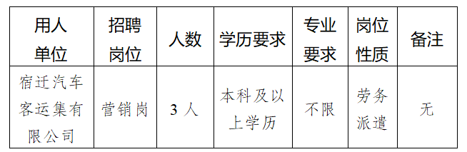 1、用工性質為勞務派遣,勞動關系錄用人員與勞務派遣公司簽訂勞動合同,并勞務派遣至宿遷汽車客運集團有限公司營銷崗位工作;